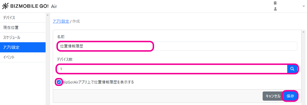 BizGo! Airアプリ上で位置情報履歴を表示するチェックをONにします