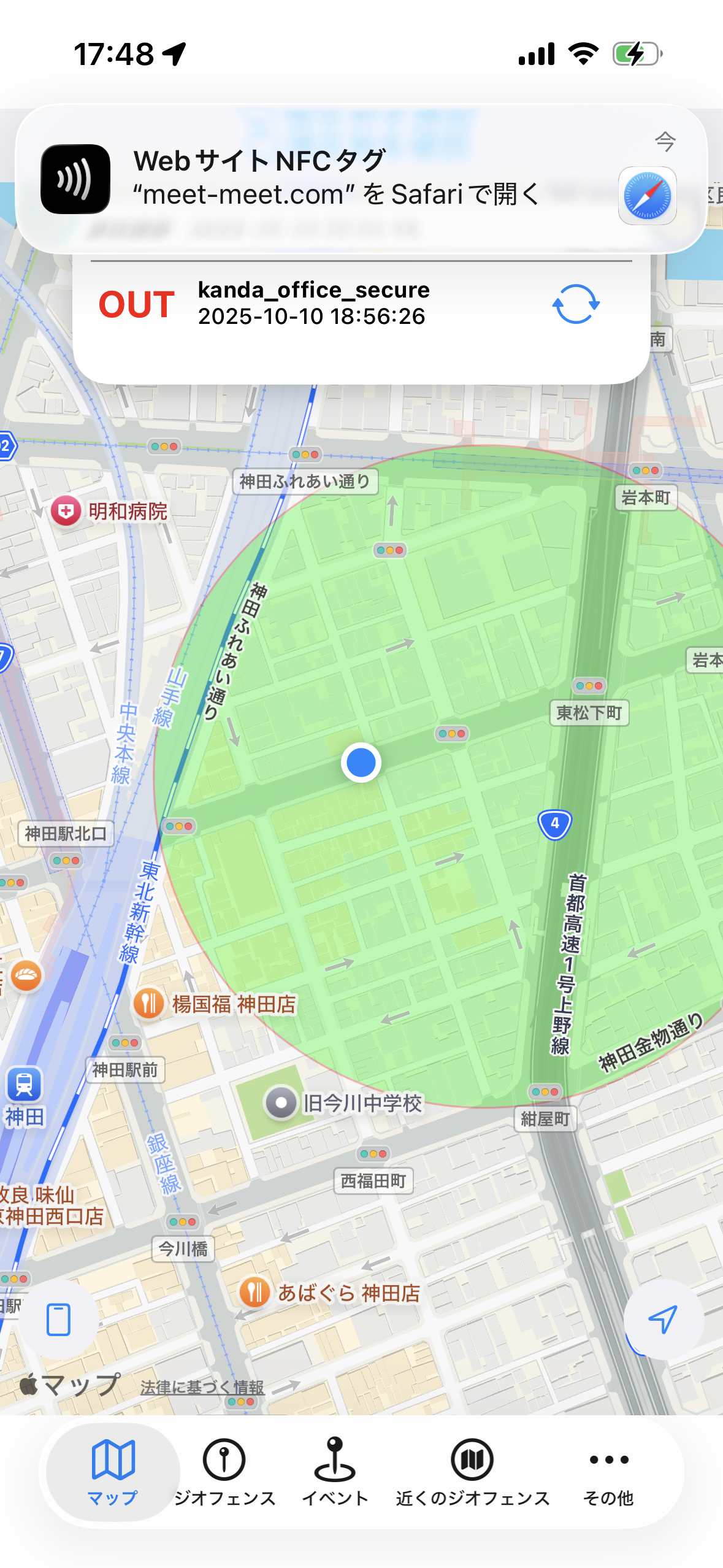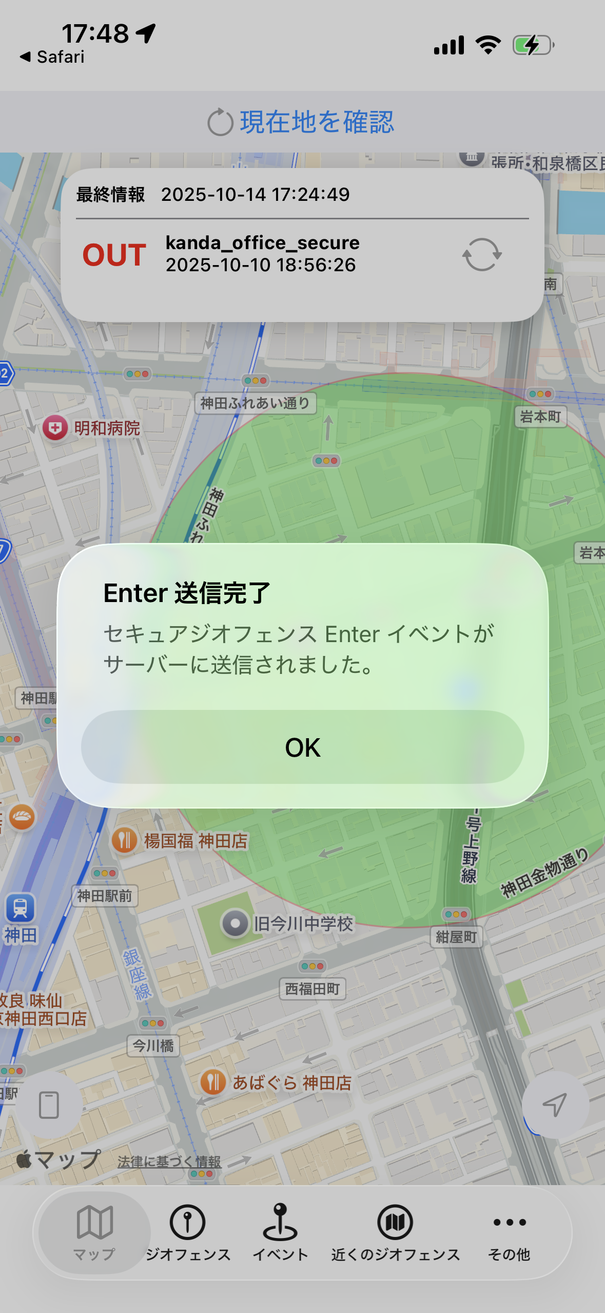 1. 現在地は、セキュアエリアジオフェンスより中にありますが、管理状態は「OUT」となっています。