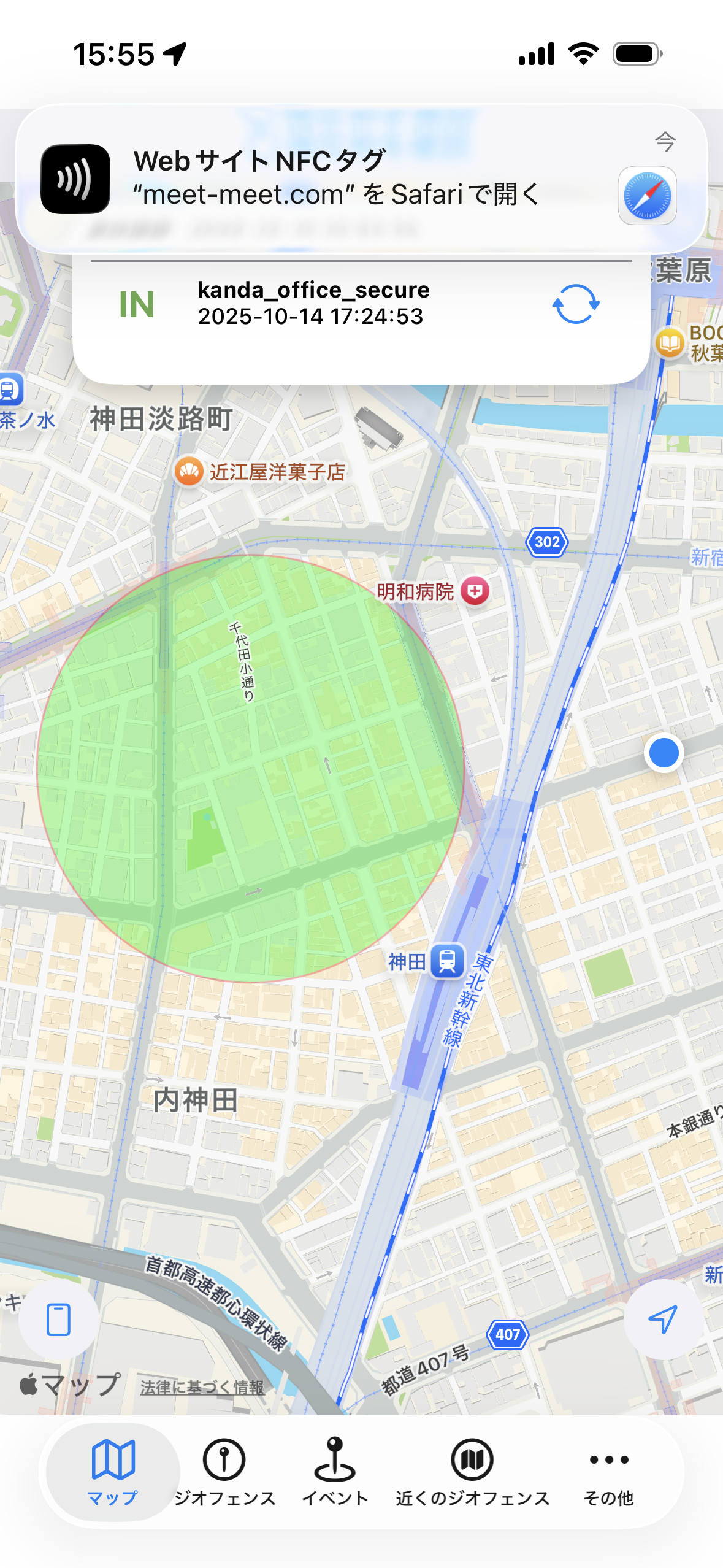 1. 現在地は、セキュアエリアジオフェンスより外にありますが、管理状態は「IN」となっています。