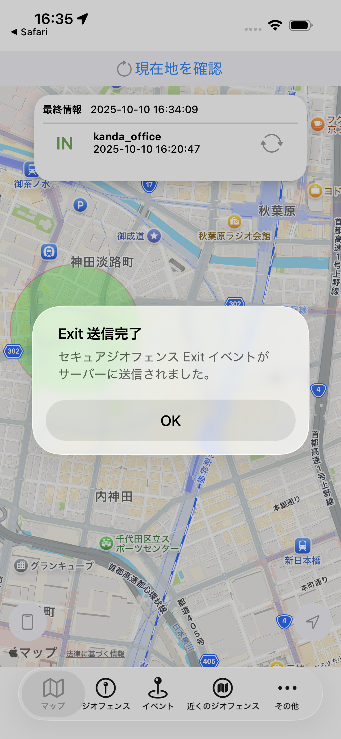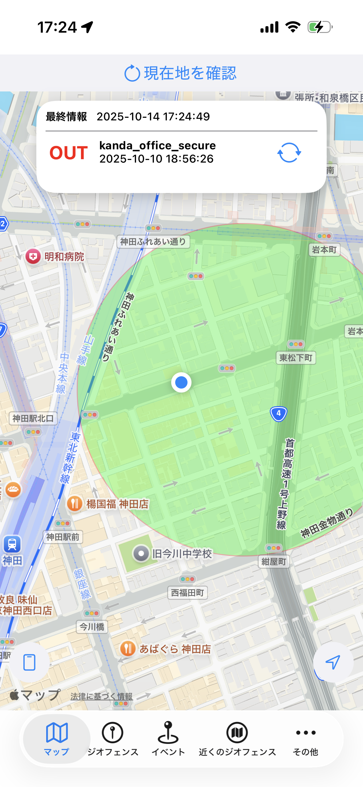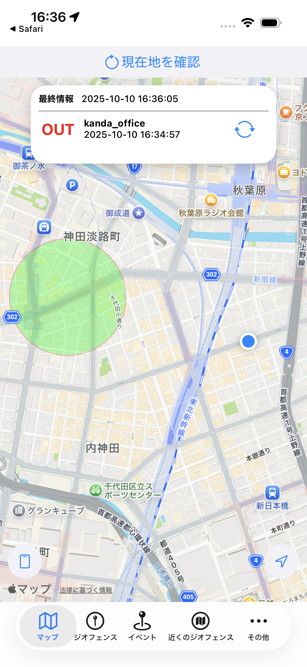 1. 現在地は、セキュアエリアジオフェンスより中にありますが、管理状態は「OUT」となっています。