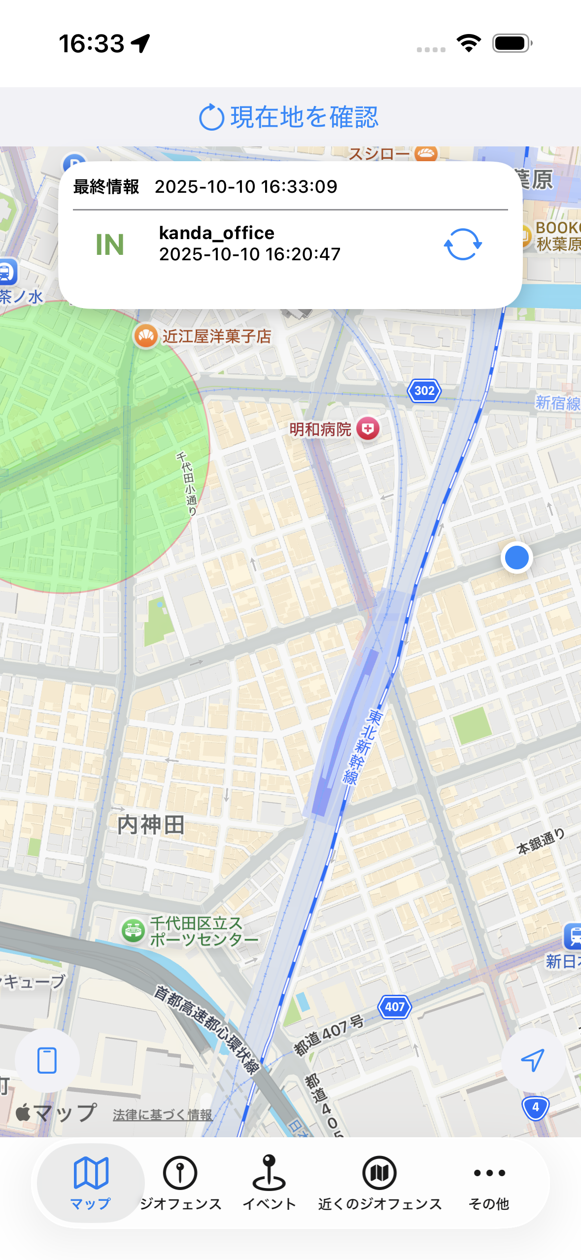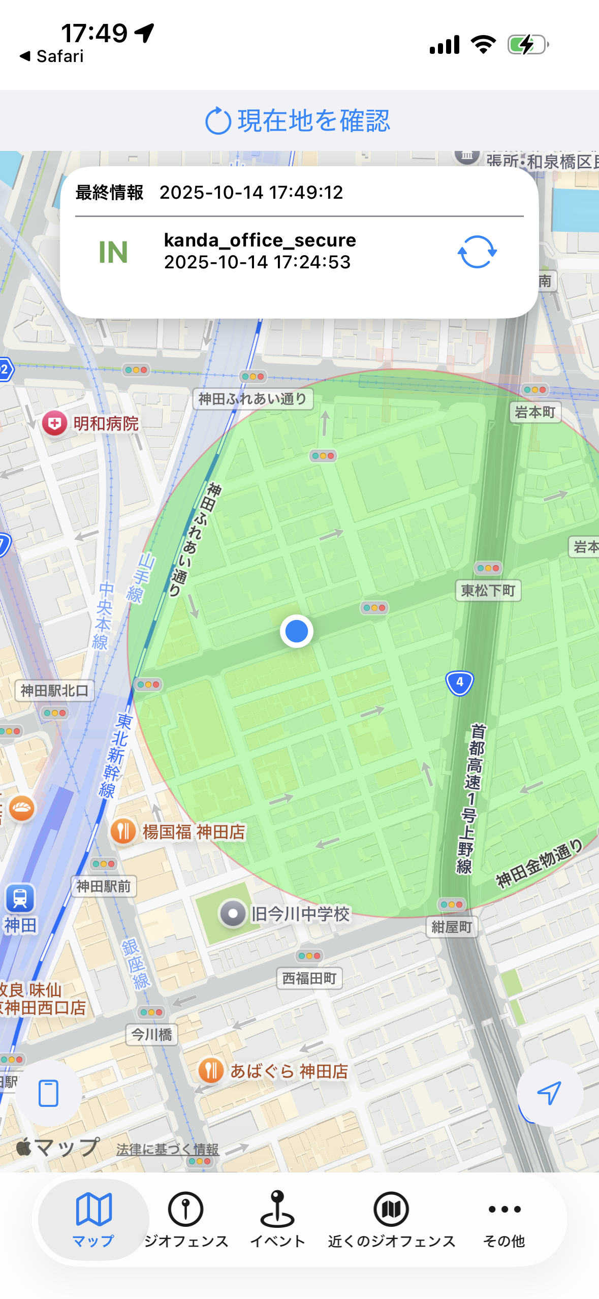 1. 現在地は、セキュアエリアジオフェンスより外にありますが、管理状態は「IN」となっています。