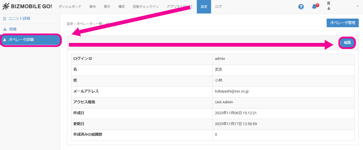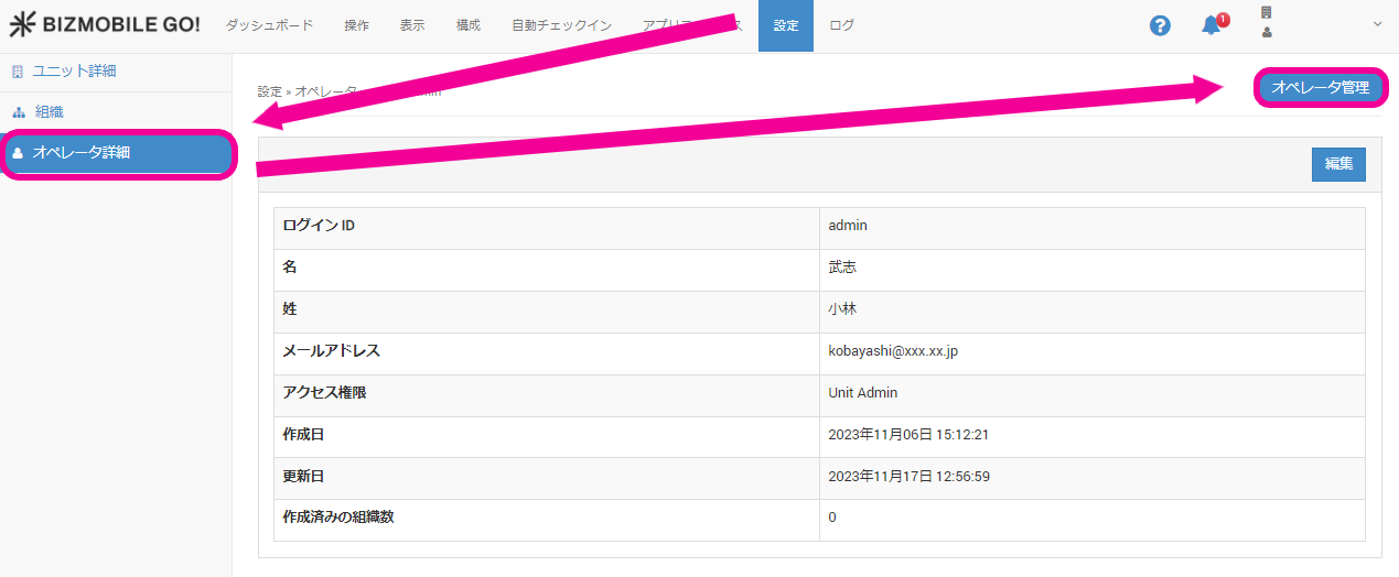 Unit Adminの権限でログインした場合のみ、オペレータ詳細メニューが表示されます。