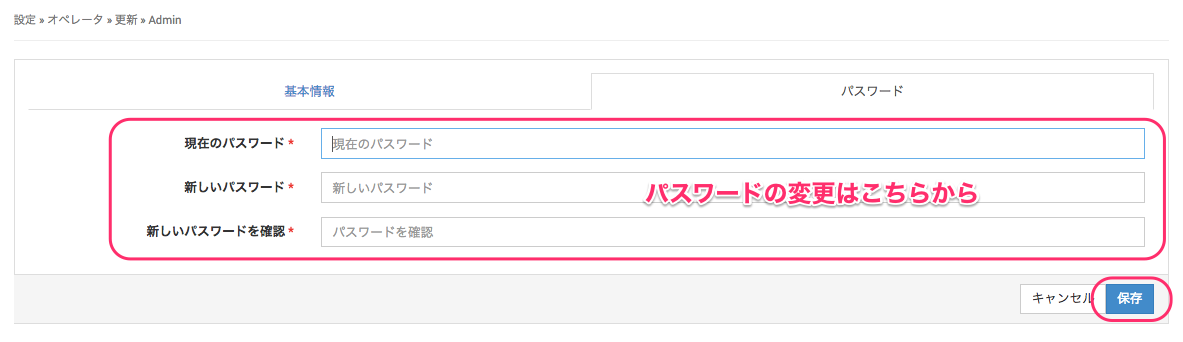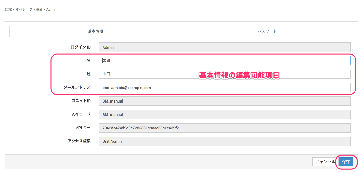 編集画面では名前やメールアドレスの基本情報と、ログインパスワードを変更することができます。