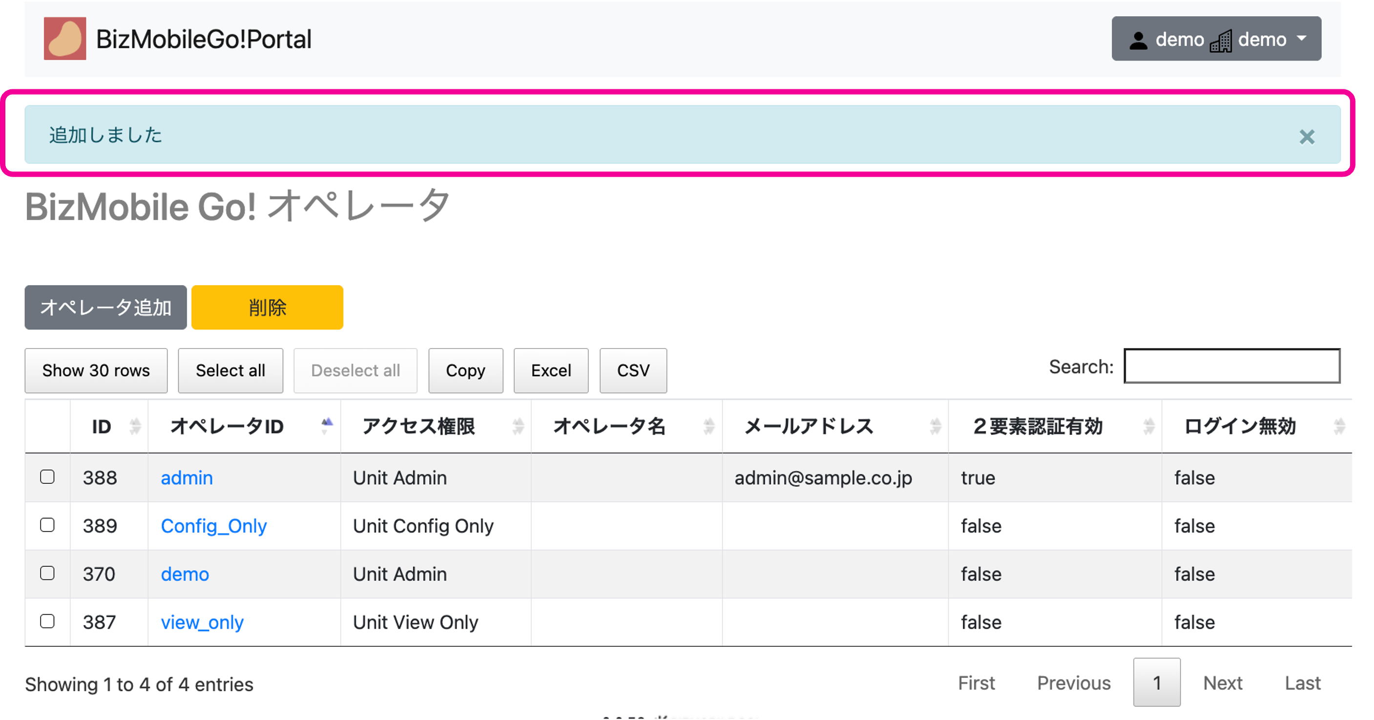 4. 追加しましたのメッセージと、登録したオペレータIDが表示されれば完了です。