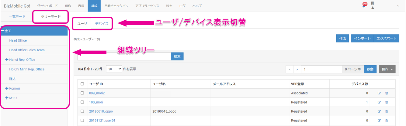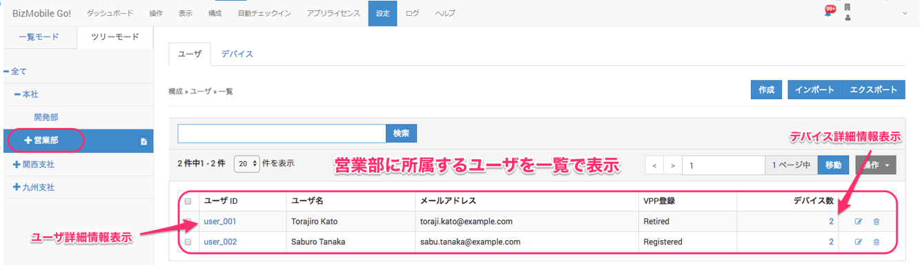 4. 確認したい組織を選択すると、その組織に所属するユーザや、管理デバイスの一覧が表示されます。