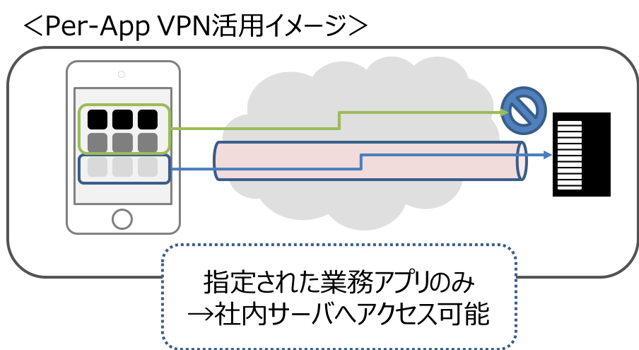 iOSプロファイルの【VPN】ペイロードで構成したVPN設定を、アプリ単位もしくはSafariのドメイン単位で適用することができます。