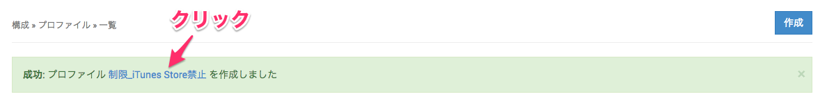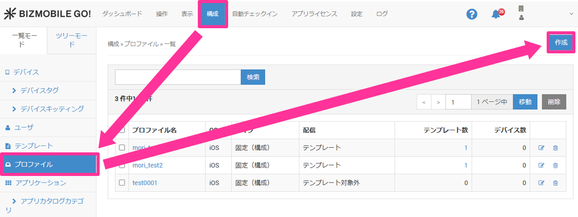 1. 【構成】→【プロファイル】画面から[作成]をクリック します。