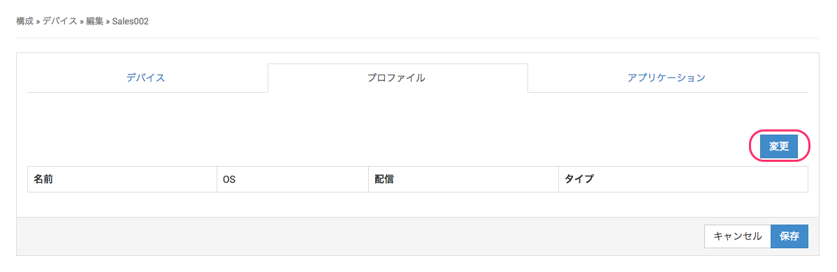2. 作成したデバイスを選択し、編集>プロファイル から[変更] をクリックします。