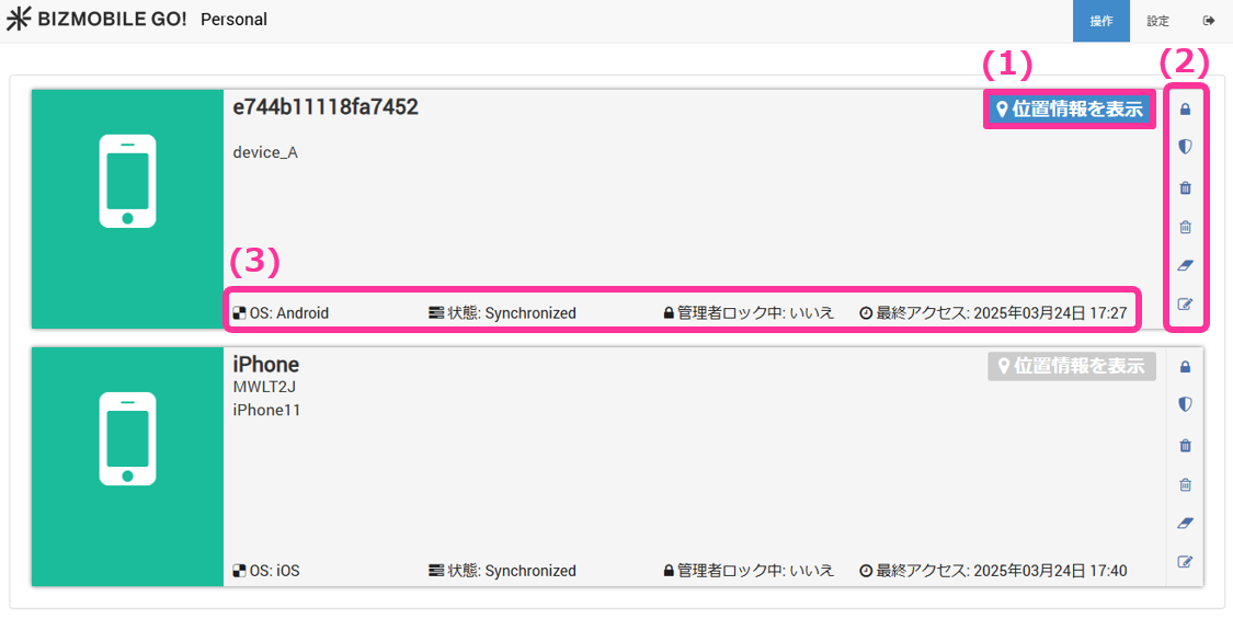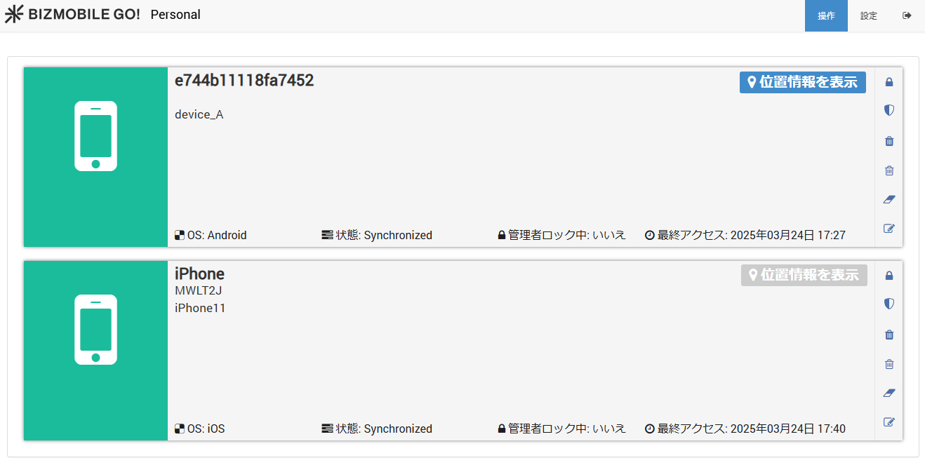 パーソナル画面には、デバイス管理担当者により割り当てられたデバイスが表示されます。