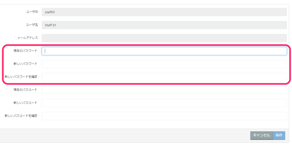 3. パスワード変更画面が開きます。現在のパスワード、変更後のパスワードを入力し、[保存]ボタンをクリックします。