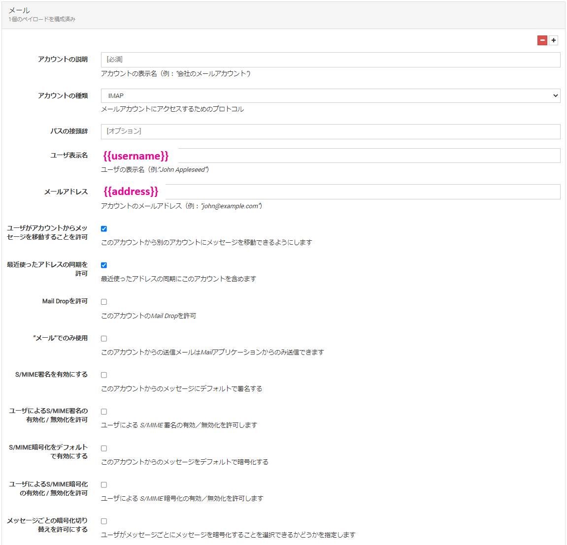 2. ユーザプロファイルで利用可能なペイロードと、その他拡張構成です。必要項目を構成し保存します。