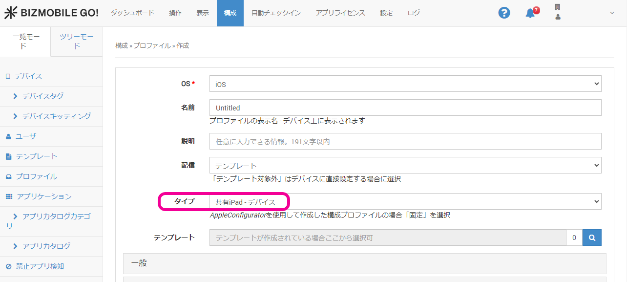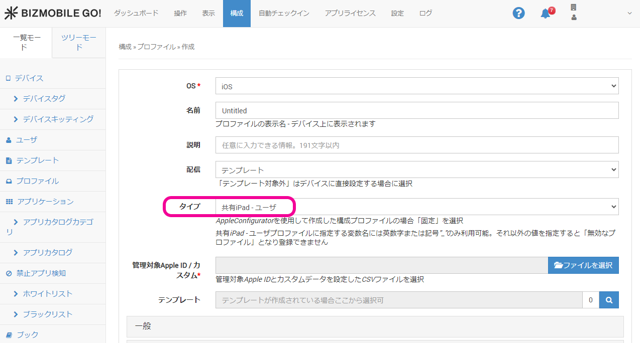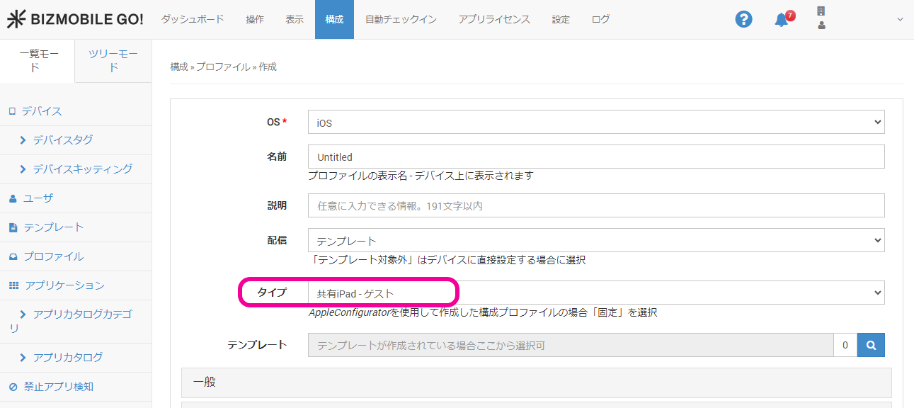 ※限定したユーザでのみiPadを利用する場合はユーザモードのプロファイルを作成します。