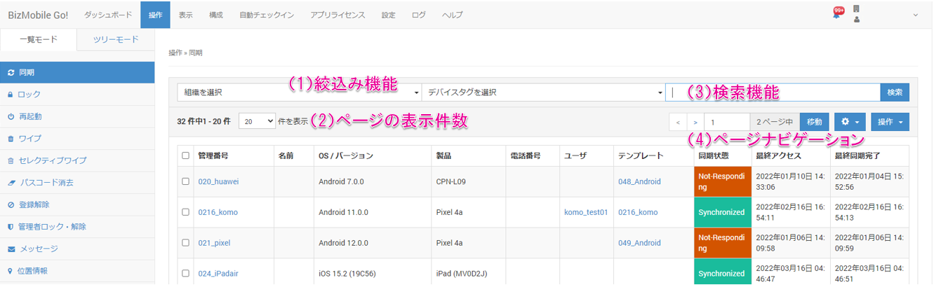 それぞれの一覧画面で利用できる検索項目につきましては、デバイスを遠隔操作する 登録情報の一覧を見るの各項目をご覧ください。