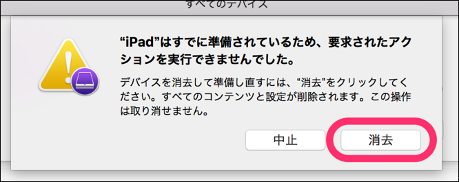 〇〇はすでに準備されているため、要求されたアクションを実行できませんでした。のダイアログが表示されたら、[消去]をクリックします。