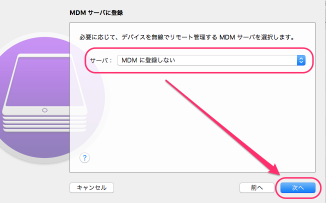 1. サーバ:MDMに登録しないを選択し[次へ]をクリックします。