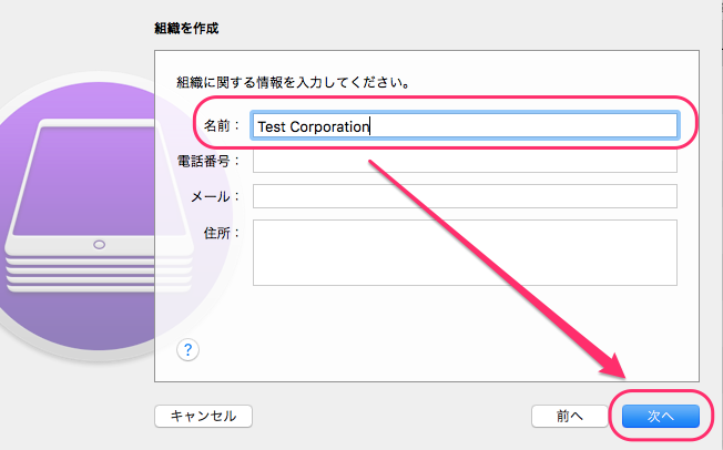1. デバイスをご利用になる組織名(例:社名等)を名前欄に入力し[次へ]をクリックします。