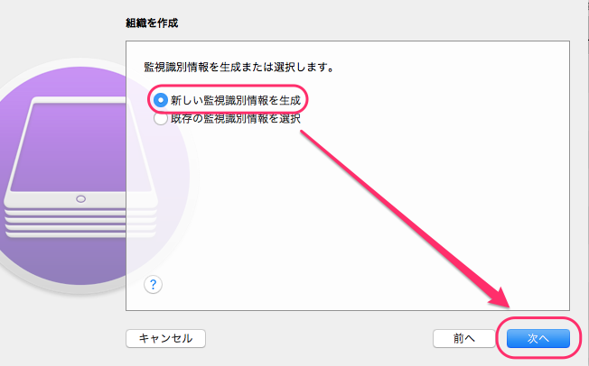 1. 新しい監視識別情報を生成を選択し[次へ]をクリックします。