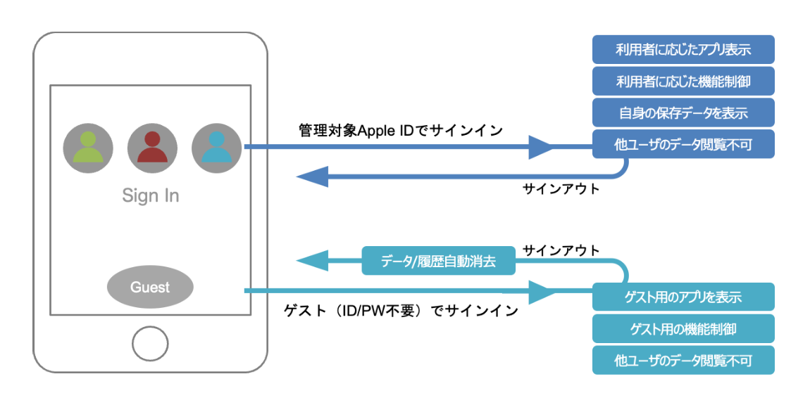もしくは、管理対象Apple ID不要のゲストモードで、不特定多数の一時利用者(ゲスト)にiPadを利用させることもできます。