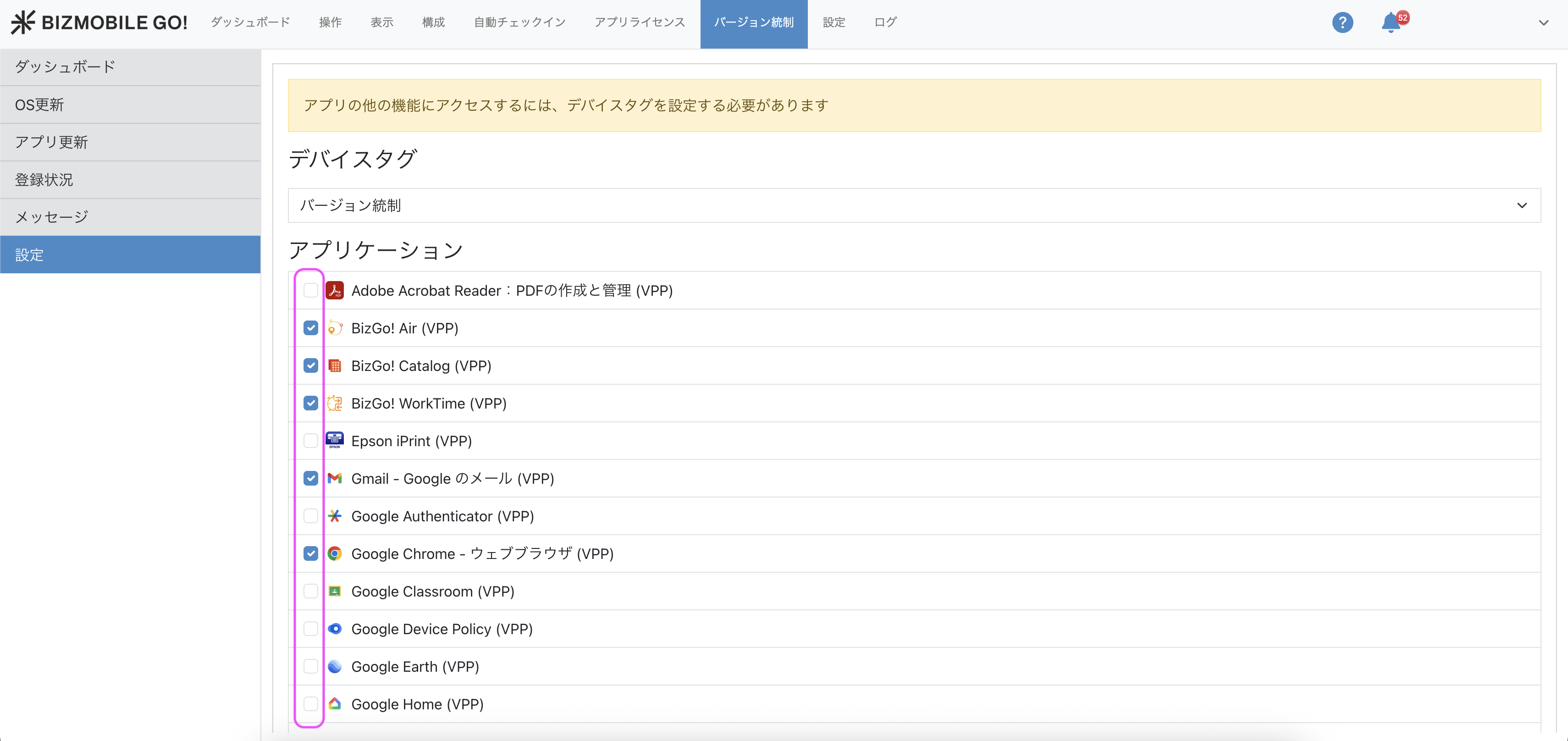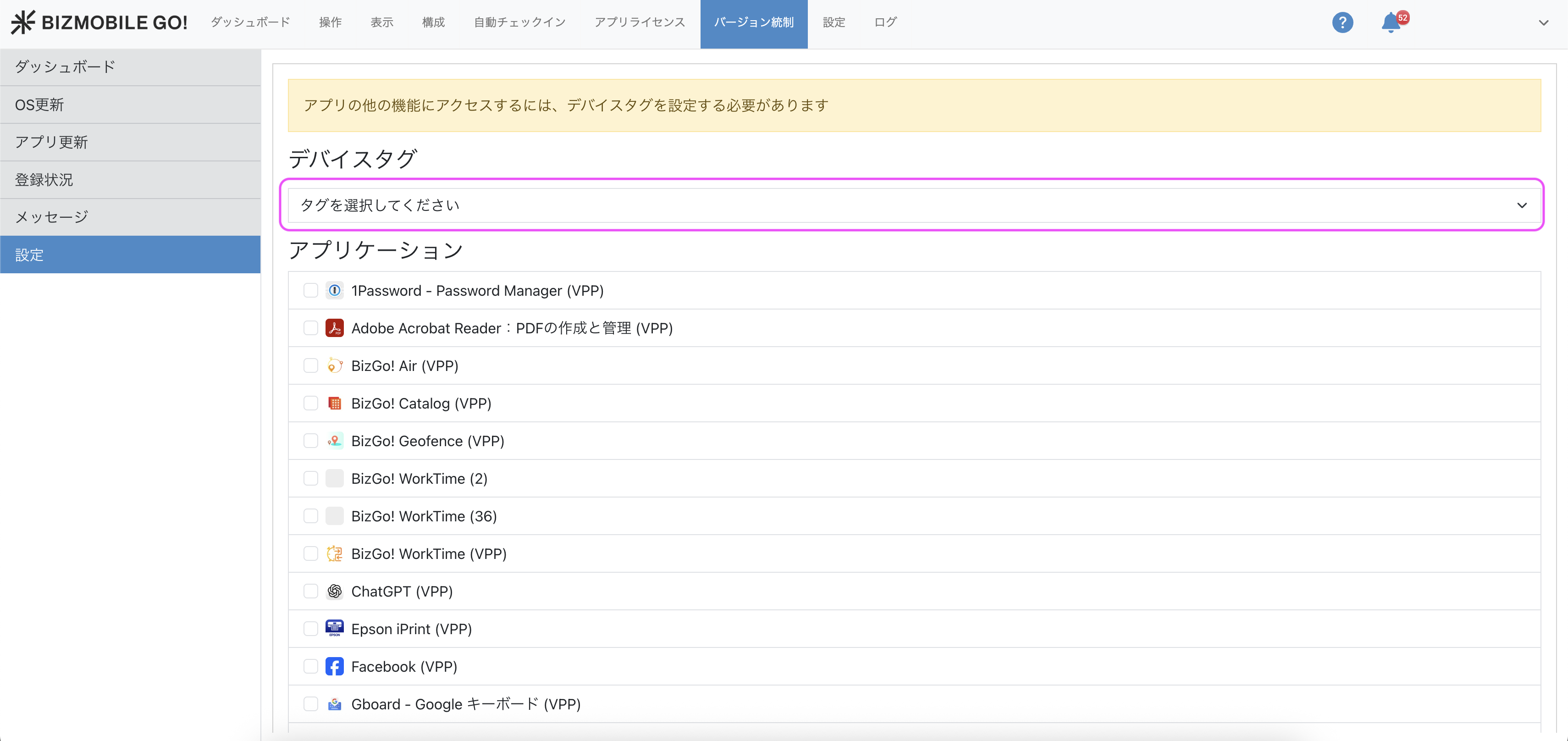 バージョン統制機能の利用対象とするデバイスは、デバイスタグで指定します。 こちらをご参照の上、事前に1つデバイスタグを作成し、対象デバイスへ割り当てを行います。