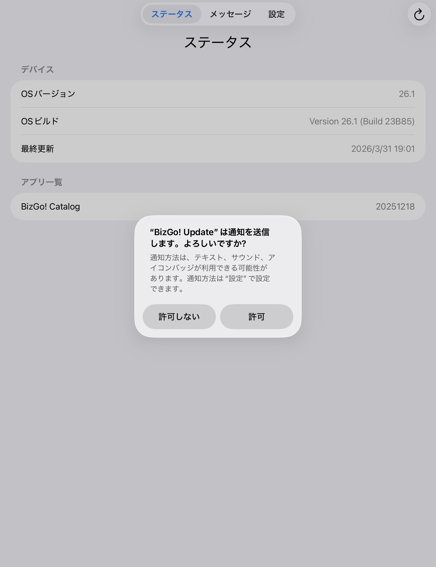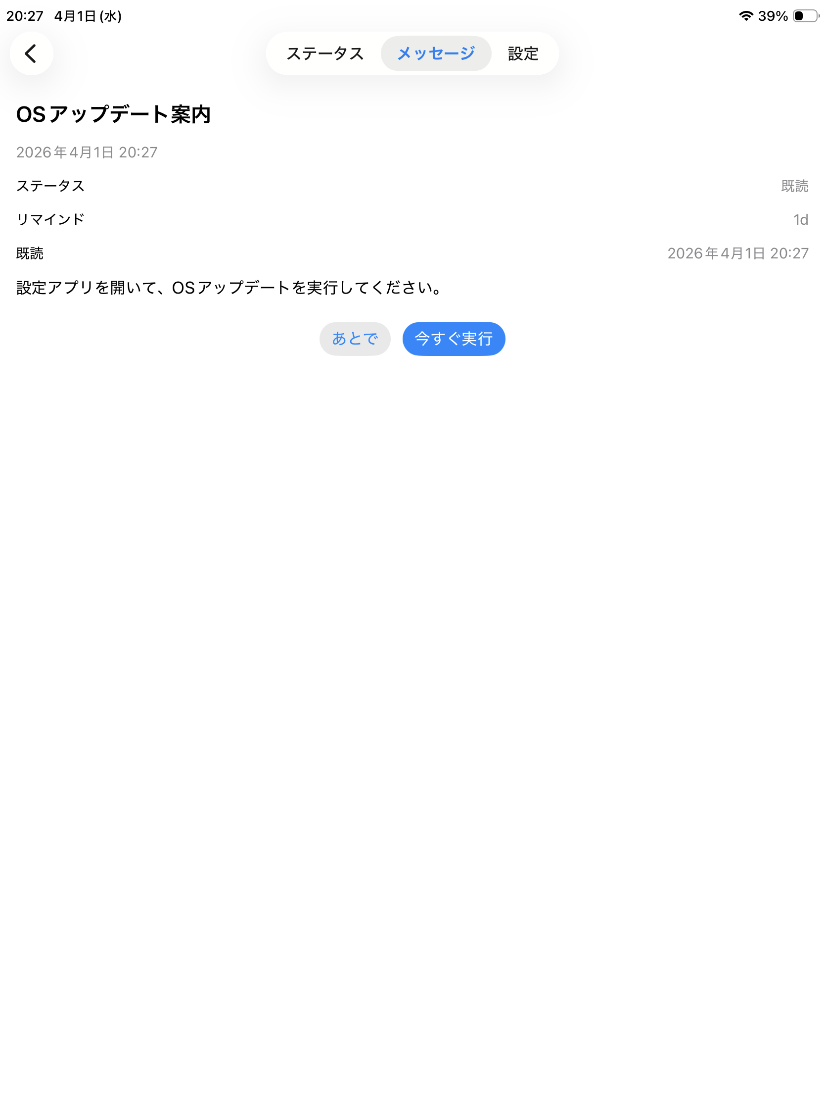 管理者からのメッセージを確認して、アップデート操作を行います。 OSアップデートは、設定アプリから手動で実行します。