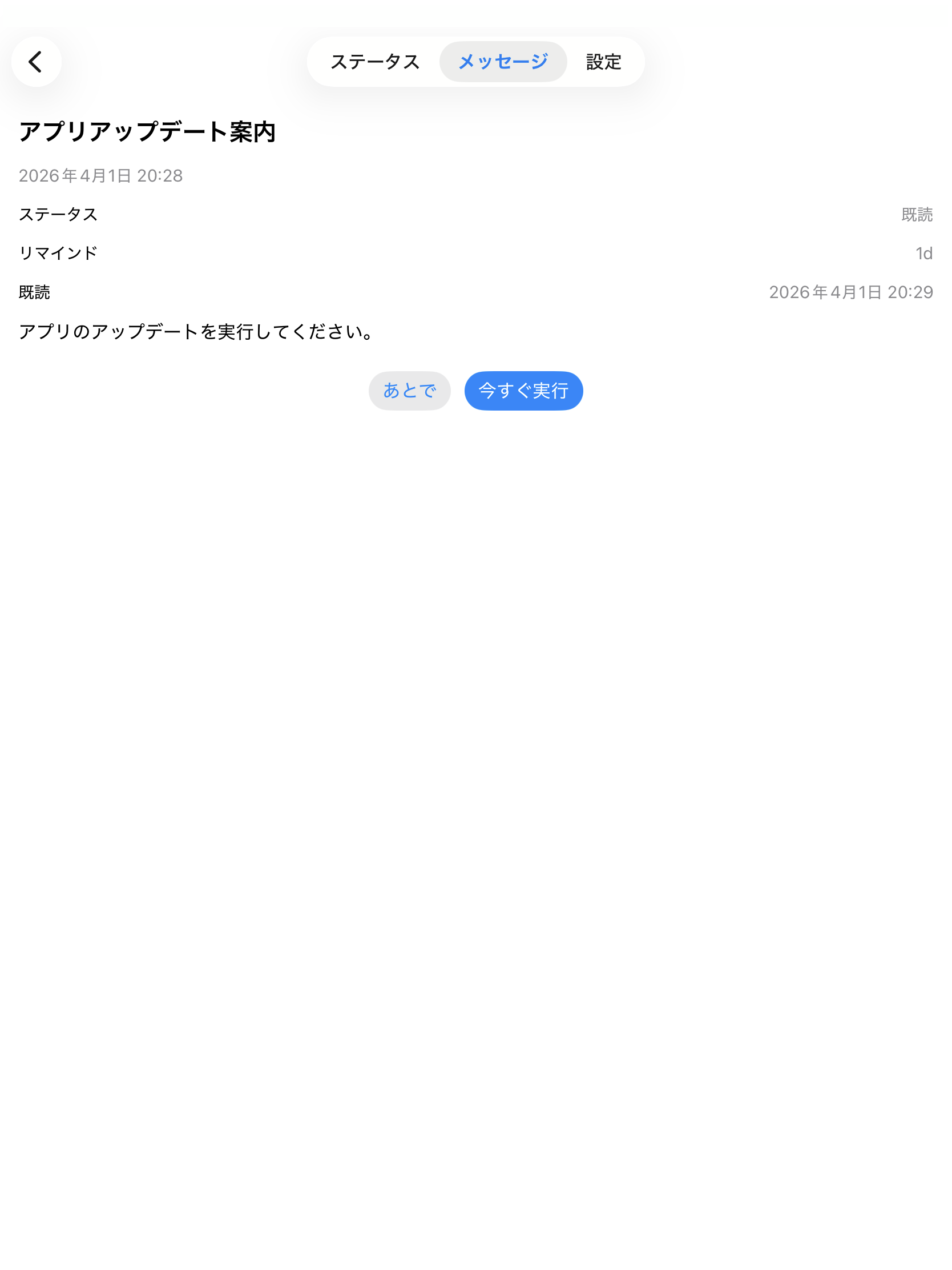 今すぐ実行 をタップするとアップデート命令要求がMDMサーバへ送信されます。その後、アプリアップデート命令が実行されます。