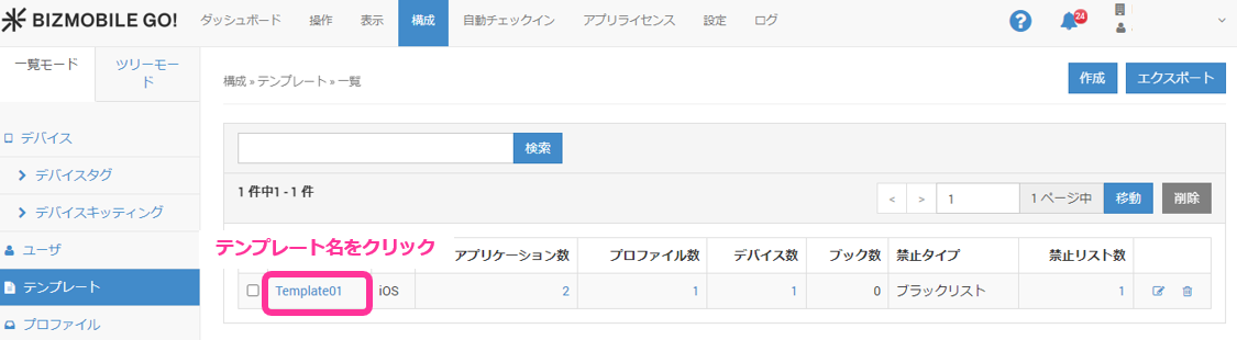 1. 【構成】→【テンプレート】からコピーしたいテンプレートの名前をクリックします。