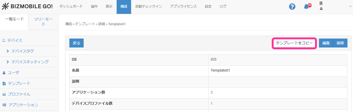 コピー元のテンプレートに含まれるアプリケーション等の設定は引き継がれ、編集も可能です。