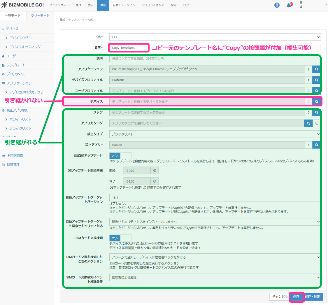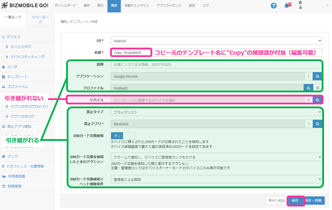 ただし、コピー元のテンプレートで指定されている管理デバイスは引き継がれませんので、別途指定が必要になります。