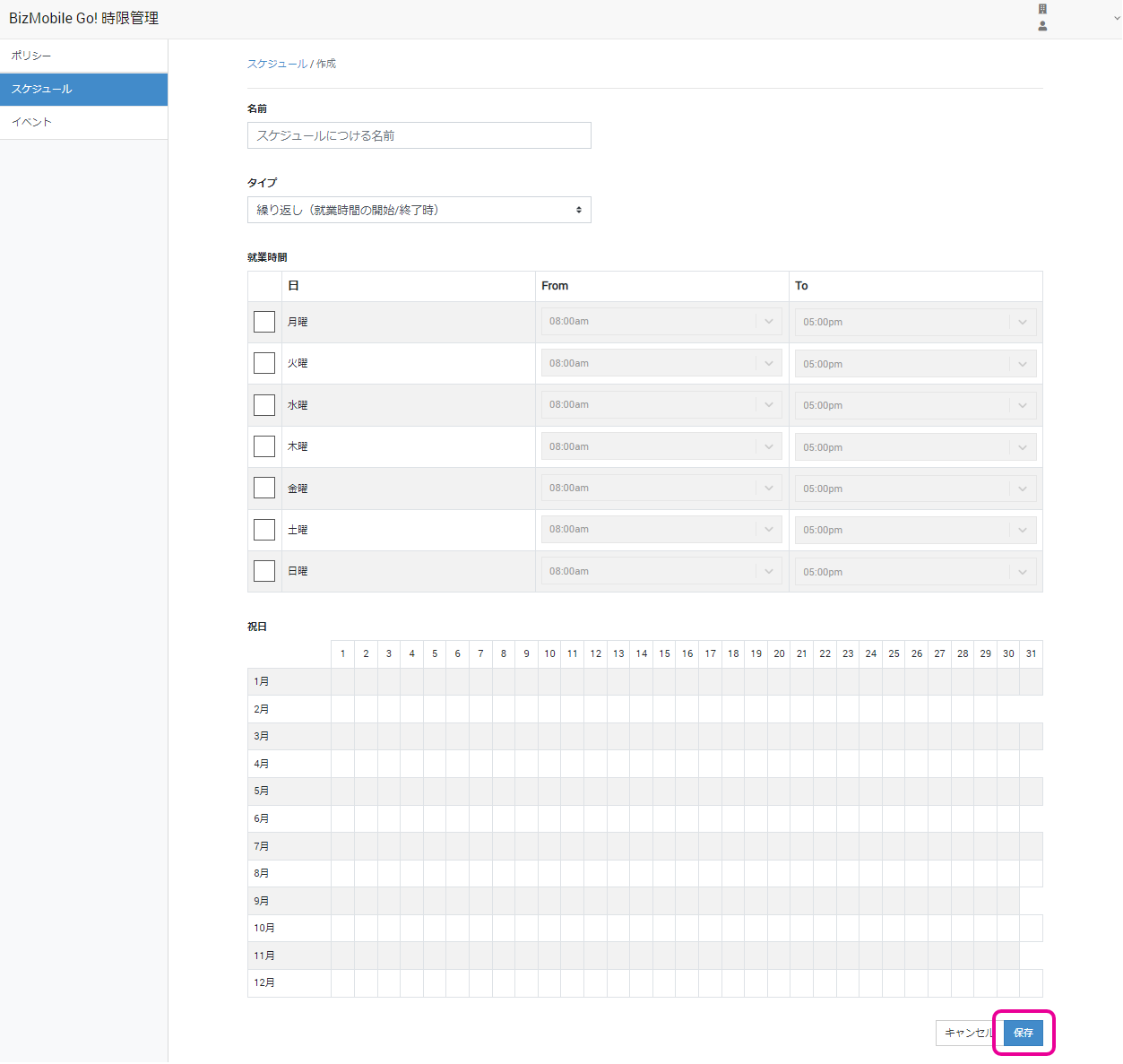 時限切替を行う時間を勤務時間に合わせて指定し、スケジュールを作成します。