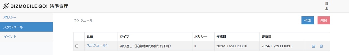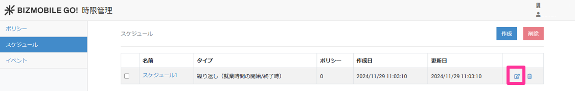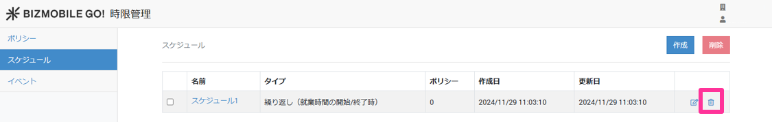 1. 【スケジュール】画面から、削除するポリシーをのアイコンをクリックします。