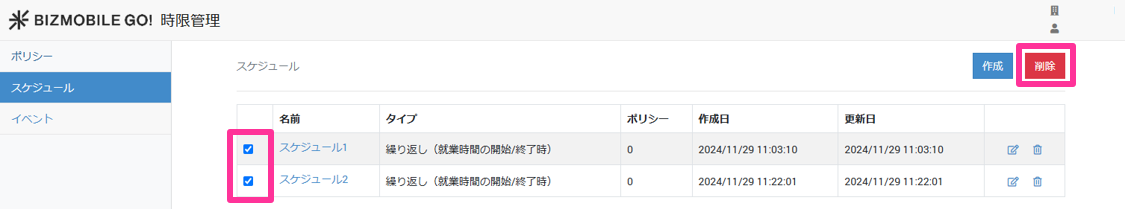 1. 【スケジュール】画面で、削除するスケジュールにチェックを入れ[削除]をクリックします。