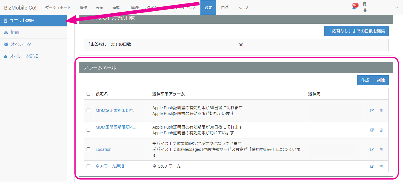 - 【構成】 → 【ユニット詳細】画面のアラームメールの項目から、[作成]をクリックします。