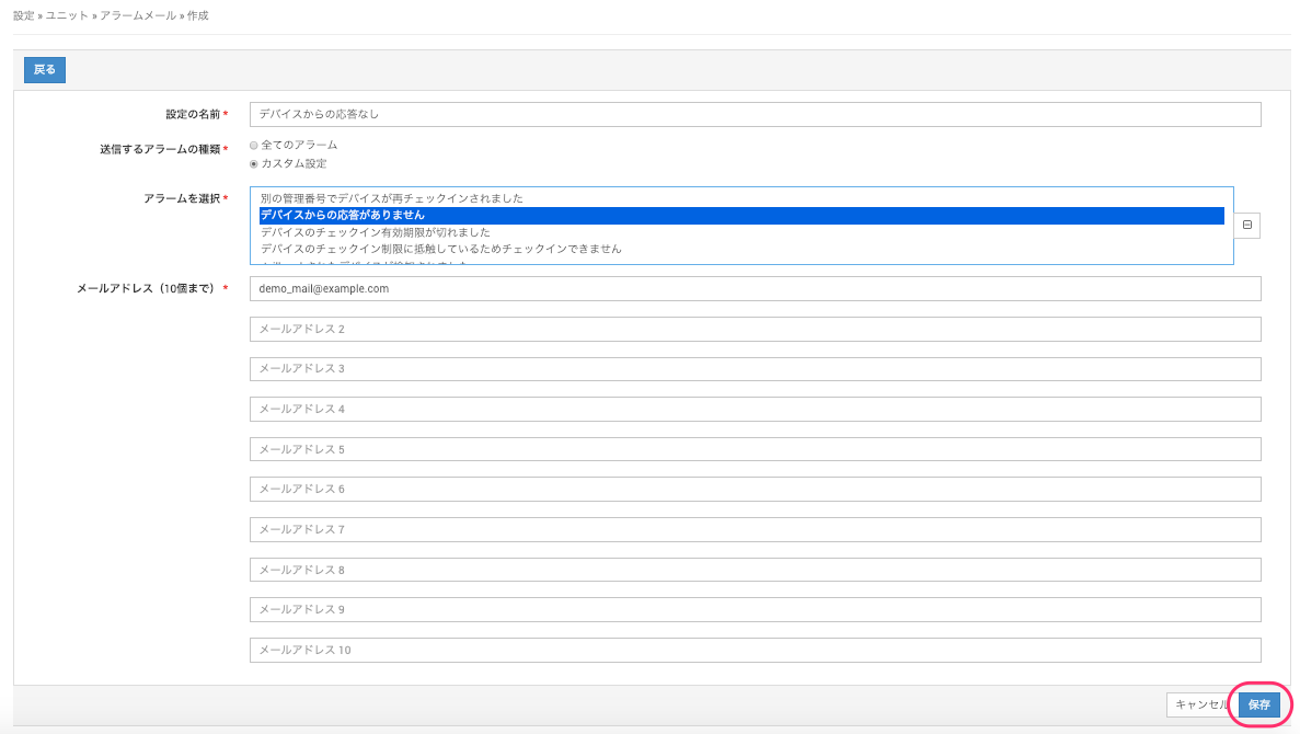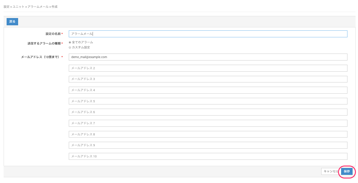 「全てのアラーム」を選択すると、ユニットで発生した全てのアラームに対して、指定したメールアドレスにアラームの発生を知らせるメールが送信されます。「設定の名前」と「メールアドレス」を入力し、[保存]をクリックします。