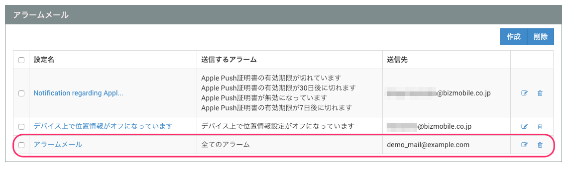 作成したアラームメールを削除する場合は、削除アイコンをクリックし、削除してください。