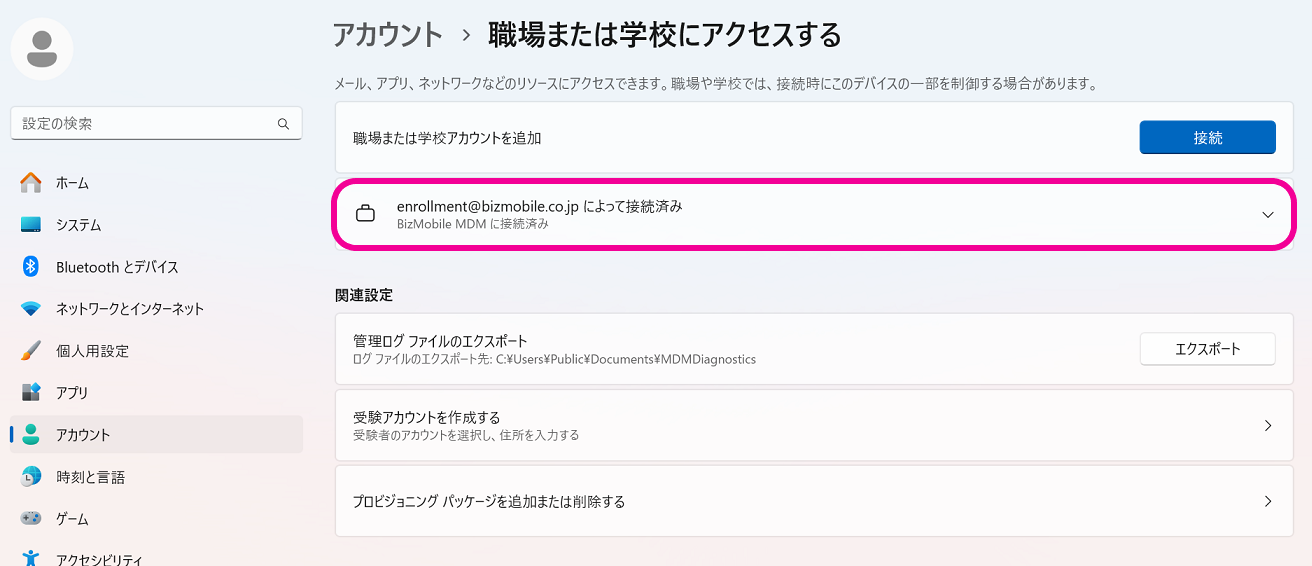 1. チェックイン完了後は、職場または学校にアクセスするBizMobile MDMに接続済みと書かれたアイコンが表示され、手順5.で入力した情報が表示されます。