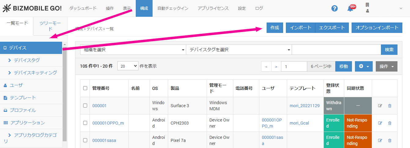 1. 【構成】 → 【デバイス】画面から[作成]をクリックします。
