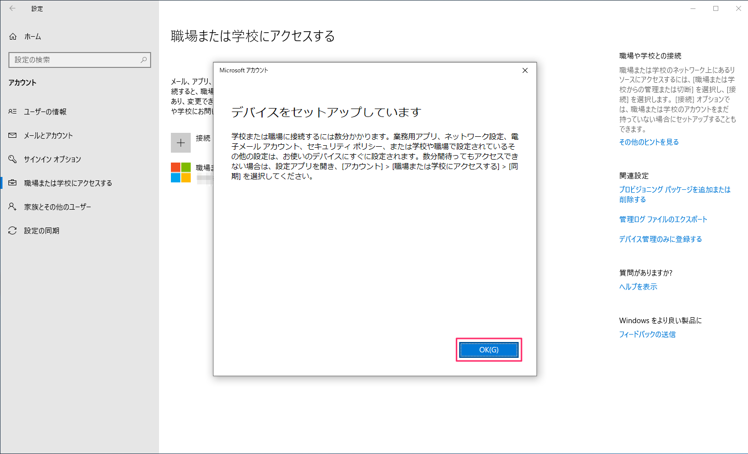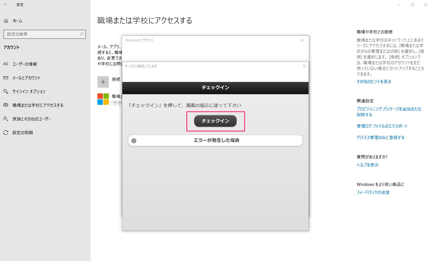 1. デバイス上で、設定>アカウント>職場または学校にアクセスする にMDMに接続済みの表示があればチェックイン完了です。
