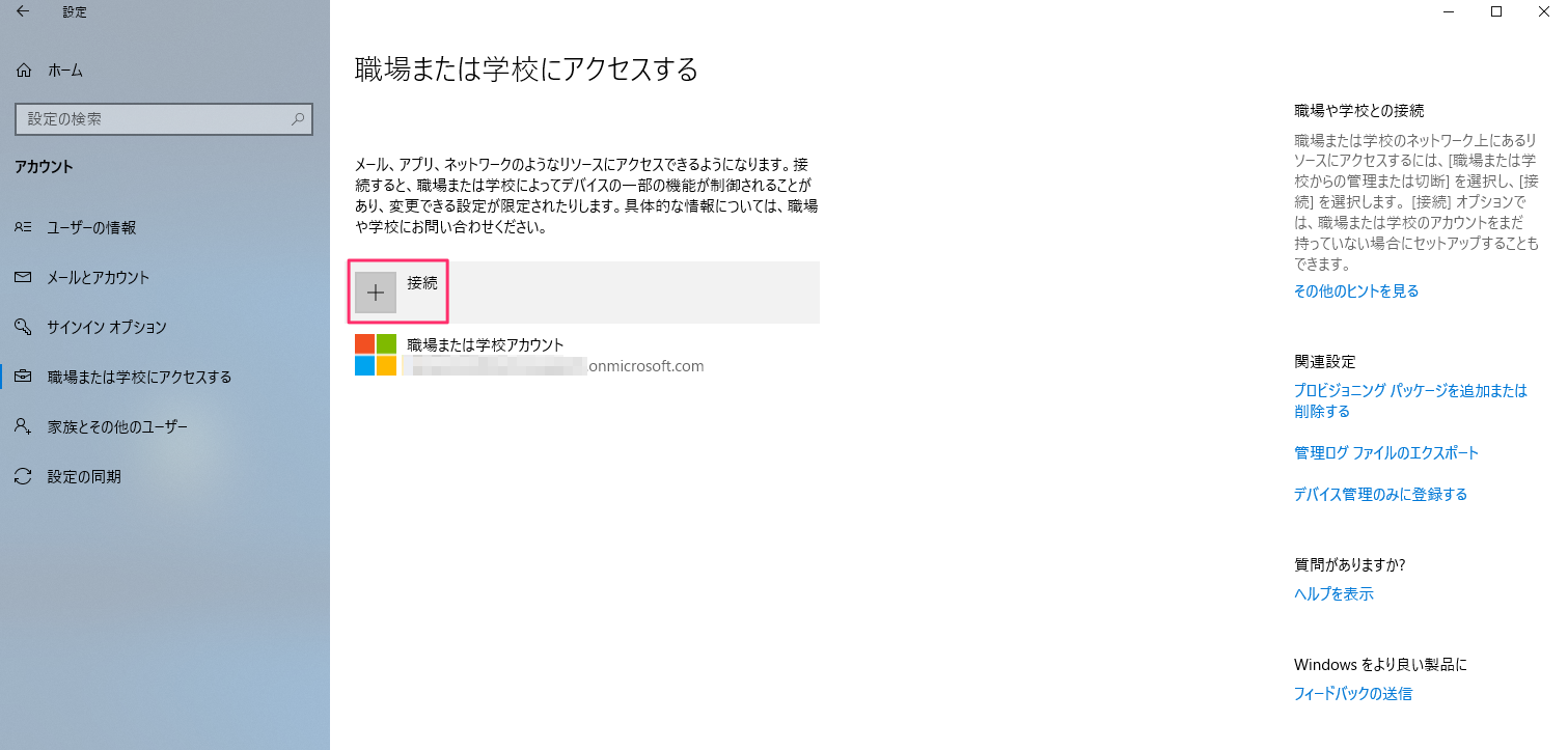1. 職場または学校にアクセスするから、[+接続]をクリックします。