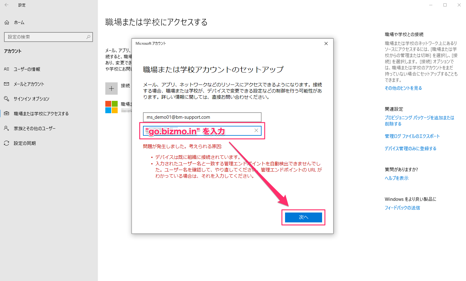 1. 問題が発生しました。考えられる原因とメッセージが表示されます。ここで、サーバーアドレス入力欄にgo.bizmo.inと入力し、[次へ]をクリックします。