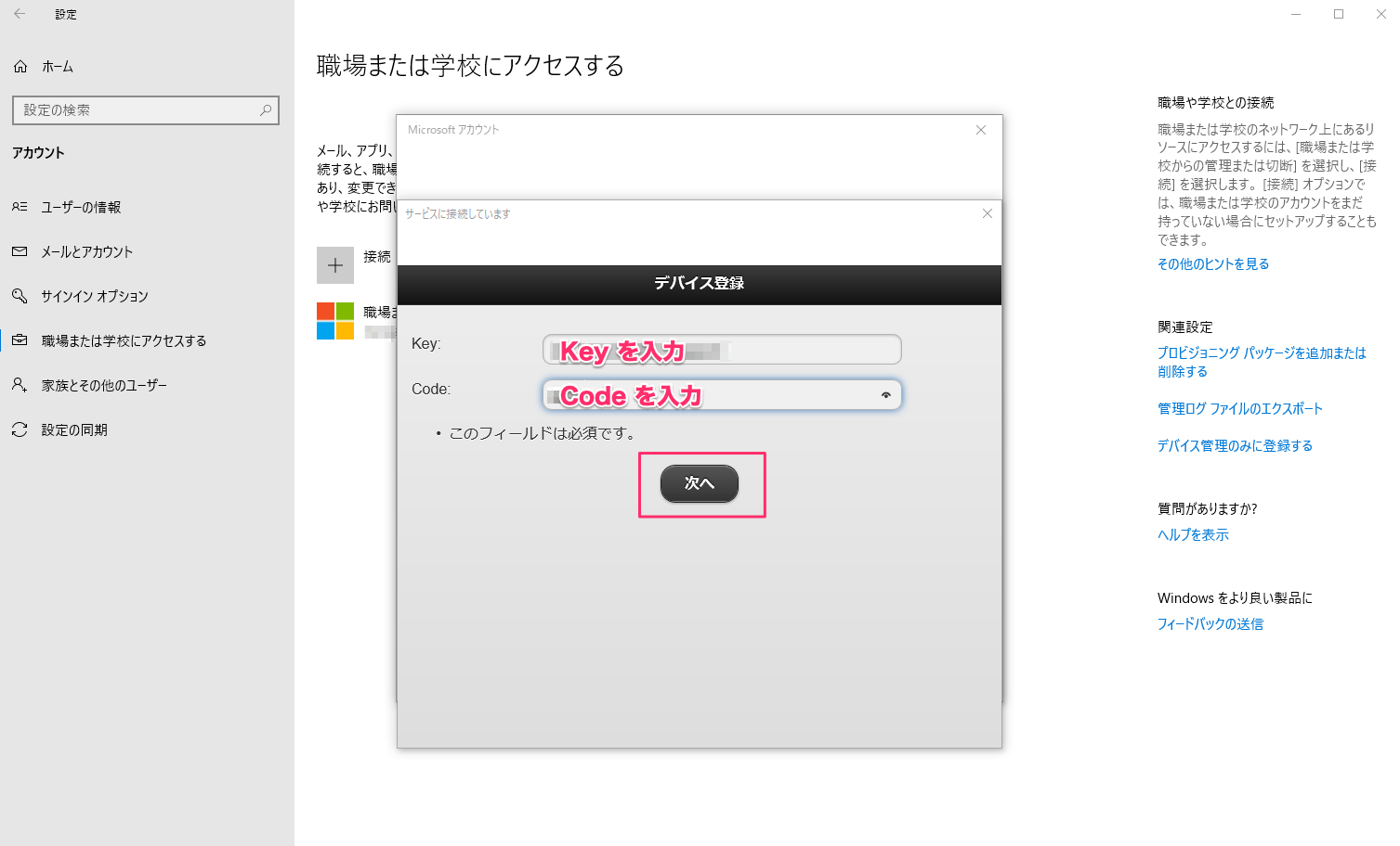 ここで、Key入力欄に”デバイスの管理番号@ユニットID”を、Code入力欄にチェックイン用コードを入力し、[次へ]をクリックします。