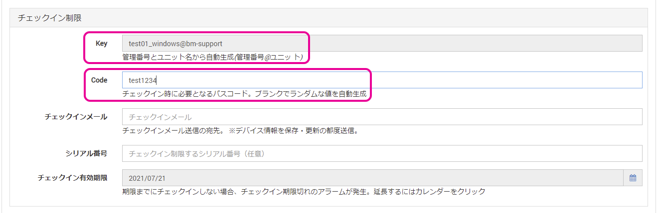 1. 管理画面の デバイス詳細>チェックイン制限 に表示されているKey/Codeをメモしておきます。