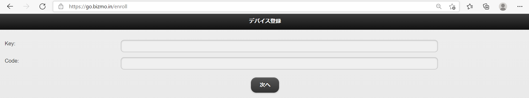 1. デバイスより、チェックインサイト(https://go.bizmo.in)へアクセスし、手順2でメモしておいた、Key/Codeを入力します。