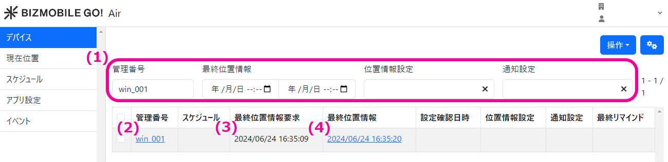 管理番号``最終位置情報取得日時``位置情報設定``通知設定``最終リマインド情報でデバイスを絞り込みできます。