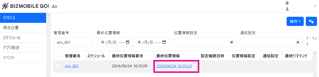 管理画面から位置情報を取得を行った最後の日時が表示されます。