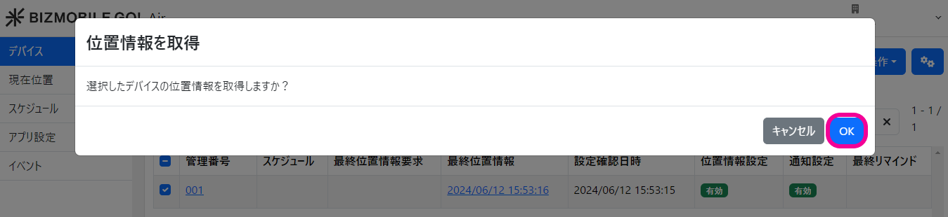 3. 選択したデバイスの位置情報を取得しますか?メッセージで[OK]をクリックします。