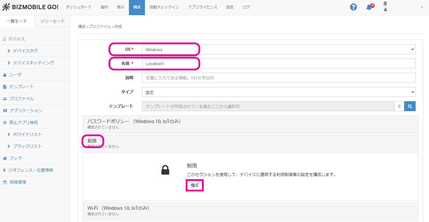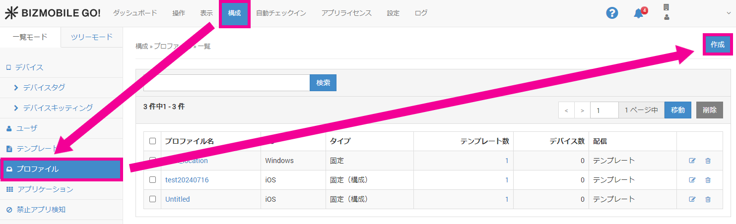1. 管理画面で、構成 > プロファイルを選択し、[作成]を押下します。