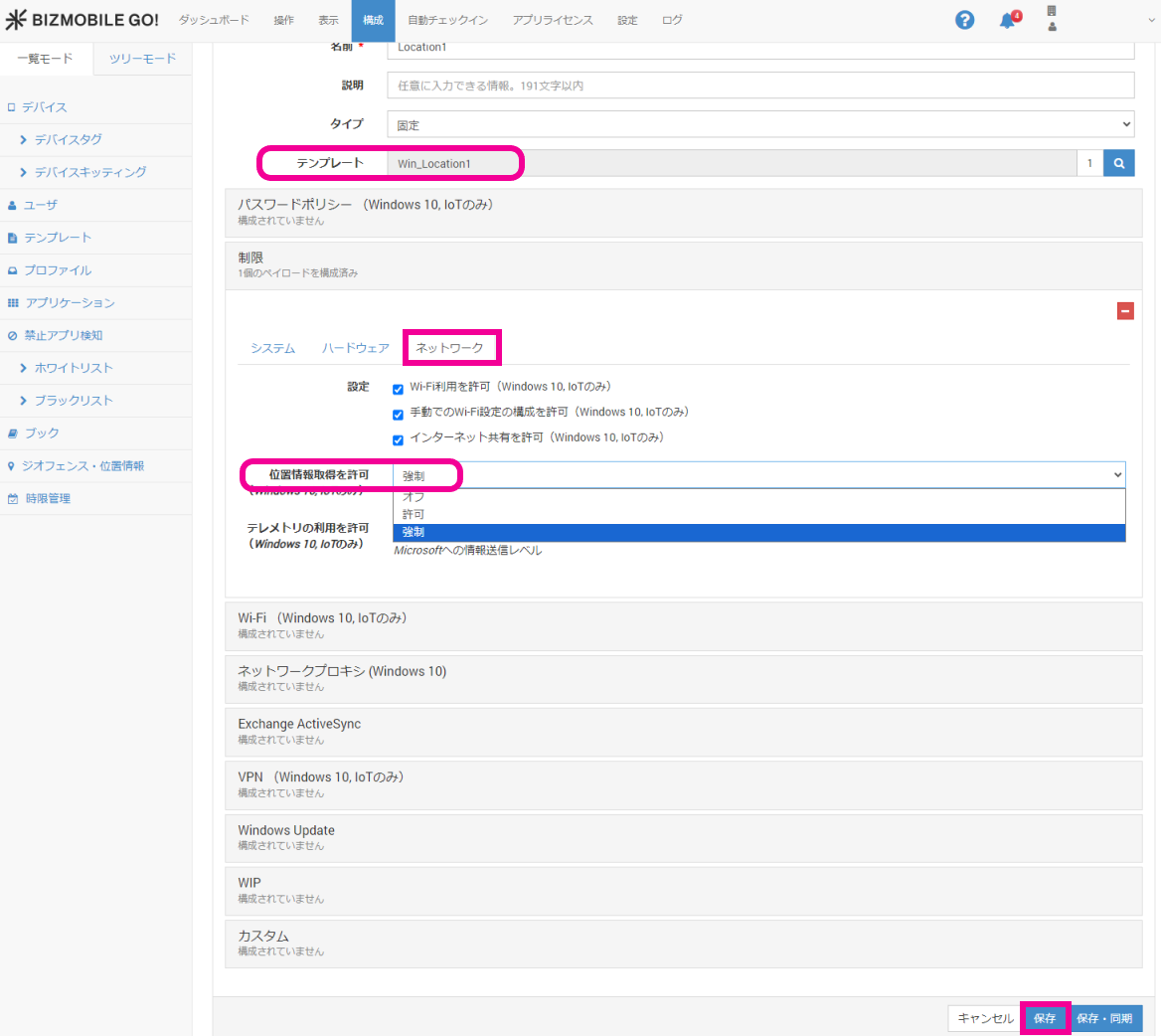 3. 必要なテンプレートを指定した後、ネットワークタブを開き、位置情報取得を許可強制を選択します。