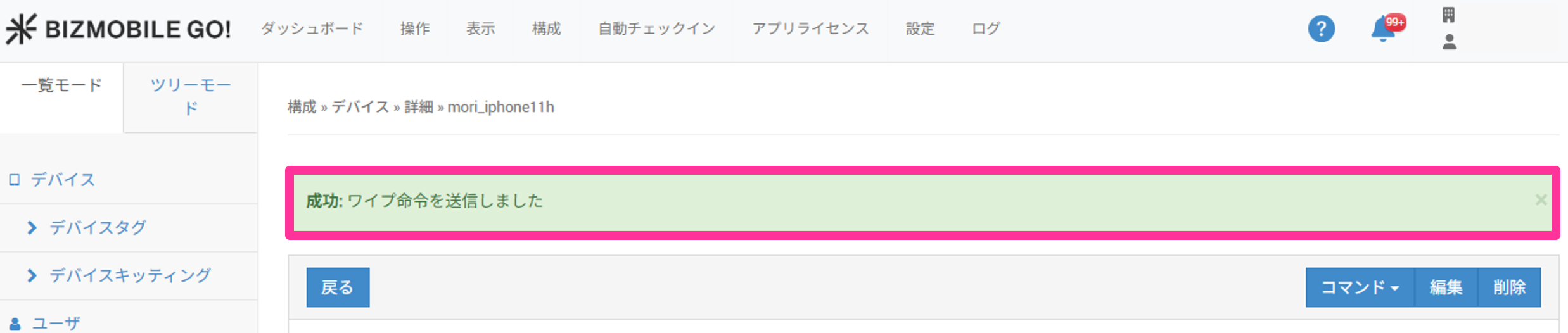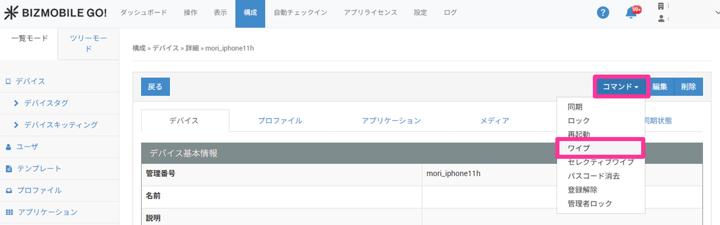 1. 【構成】→【デバイス】でワイプを実行するデバイスの管理番号をクリックします。