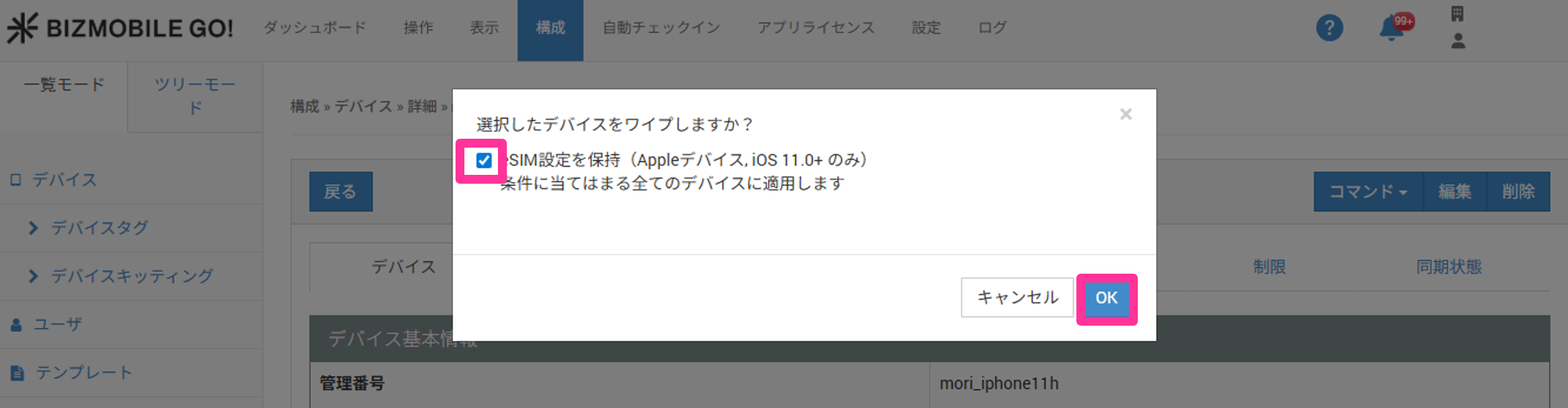 保持する場合はチェックを入れた状態で[OK]をクリックします。 eSIM情報の保持設定はiOS11以降のデバイスで有効です。
