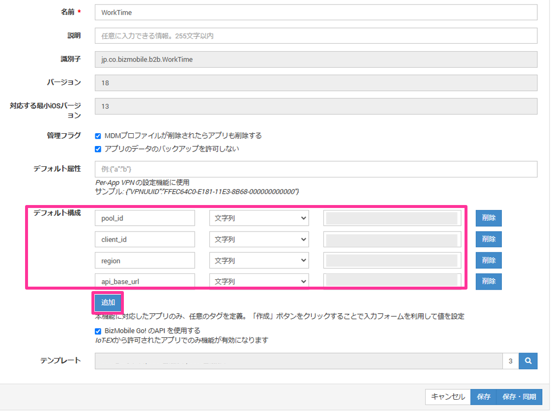 3. 展開された画面で、「デフォルト構成」の「追加」をクリックし、以下を登録します。